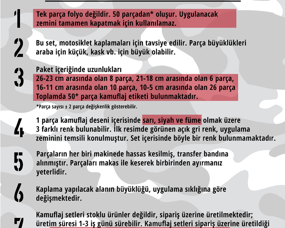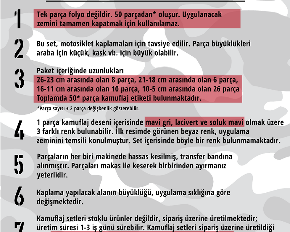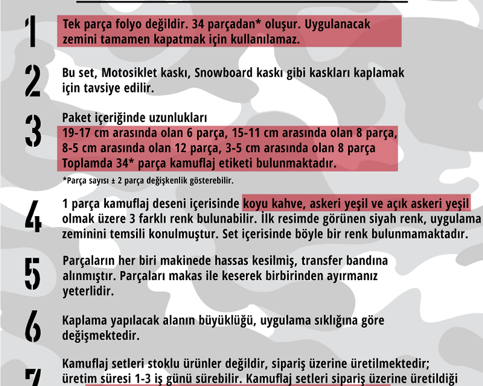 Parçalardan oluşan bu kamuflaj setleri ile motorunuza, bisikletinize, kasklarınıza, arabalarınıza, atvlere, snowboardlara ve daha bir çok yüzeye uygulama yapabilirsiniz. Parçalardan oluştuğu için aracın marka modeli farketmez, bütün setler üniversaldir. Yalnızca kamuflaj stickerlarını satın almadan önde ürün açıklamalarını dikkatlice okuyun. Örneğin bisikletinize kamuflaj uygulaması yapmak istiyorsanız, motosikletler için olan setlerin parça boyları büyük gelecektir. Stickerlarınız sudan, çamurdan etkilenmez, tazyikli yıkamada çıkmaz.*